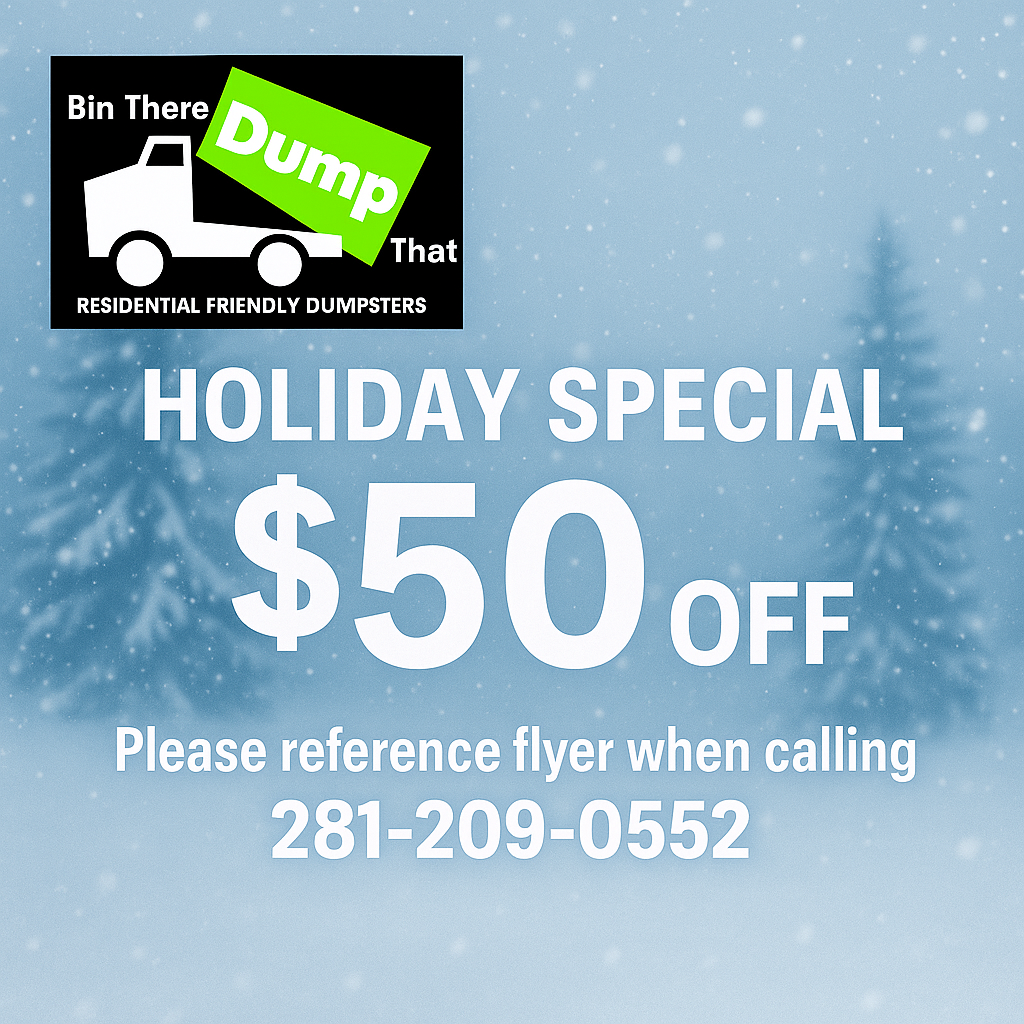 Tackle your holiday clean-up or year-end projects with ease. For a limited time, enjoy $50 off your dumpster rental from Bin There Dump That Houston.